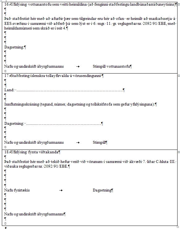 4.8. Vottunarstofa, sem hefur eftirlit með innflytjandanum samkvæmt 8. og 9. gr., skal annast umsjón með yfirlýsingu í reit 16, að fenginni staðfestingu landbúnaðarráðuneytisins skv. 6. mgr. 11. gr.