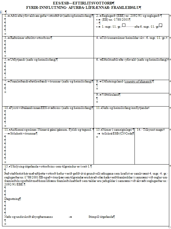 4.5. Eftirlitsvottorð skal uppsett á einu af opinberum tungumálum EES-svæðisins og útfyllt, að stimplum og undirskriftum undanteknum, annaðhvort eingöngu með stórum stöfum eða eingöngu með litlum stöfum. Eftirlitsvottorð skal að jafnaði vera útfyllt á íslensku og/eða ensku. Ef svo er ekki geta tollayfirvöld farið fram á löggilta þýðingu á íslensku eða ensku. Óvottaðar breytingar eða útstrikanir skulu ógilda eftirlitsvottorðið.