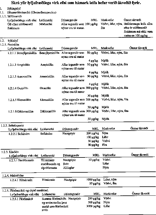 Lyfjafræðilega virk efni, sem notuð eru í dýralyf, og búið er að ákveða hámark leifa fyrir, skulu skráð í viðauka I með reglugerð þessari. Komi í ljós við mat á lyfjafræðilegu virku efni í dýralyfi, að ekki sé nauðsynlegt að ákveða hámark leifa til að tryggja heilbrigði neytenda, skal skrá efnið í viðauka II.