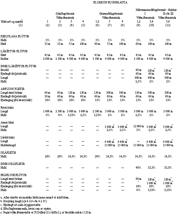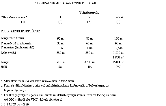 | [Nánari kröfur um bundið slitlag, þekju bundins slitlags á flugbrautum og sjónleiðsögubúnað má finna í gr. 9.4.3-9.4.32 í 1. bindi viðauka 14 við Chicago samninginn.] | ||
